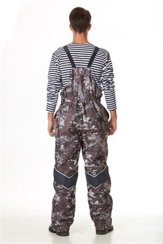 Задняя часть полукомбинезона в области талии собрана на эластичную тесьму. На задней верхней части полукомбинезона расположены бретели, собранные на эластичную тесьму. На задней половинке ПК настрочены отделочные детали со светоотражающей лентой, на передних половинках в области колен настрочены наколенники с боковыми карманами на молнии для дополнительных поролоновых наколенников. Детали из отделочной ткани: кокетки, полочки спинки, клапаны карманов, карманы рукава, одеяльные детали спинки и капюшона, отдельные детали полукомбинезона,бретели, обтачки карманы.