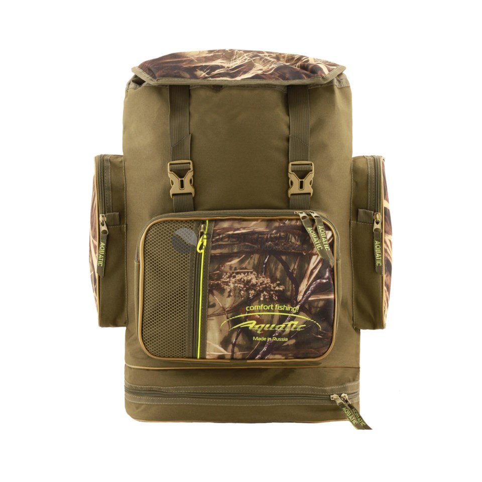 Рюкзак Aquatic из полиэстерной непромокаемой ткани повышенной прочности 600D объёмом 45 литров. Рюкзак имеет 2 изолированных отделения и нижнее вентилируемое отделение (его можно использовать для обуви или мокрых вещей). Данная модель имеет 7 дополнительных карманов и уплотненную спинку. Рюкзак пользуется большой популярностью у рыболовов и охотников.